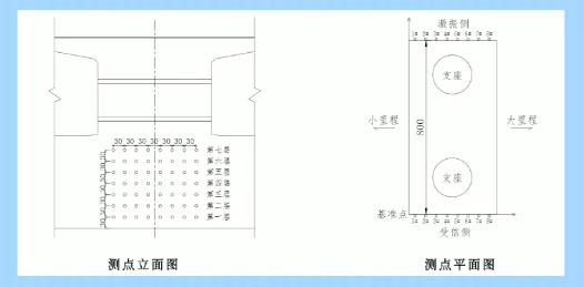 在另一檢測項目中,檢測對象同樣為某鐵路特大橋零號塊,根據(jù)現(xiàn)場實際情況進行測點布置,分別在測試部位距離底板底面30cm、60cm、90cm、120cm、150cm、180cm、210cm處布置7個檢測斷面,每個檢測斷面布置8個測點,測點間距為30cm,測試寬度為210cm,測試長度800cm,測點布置如圖: