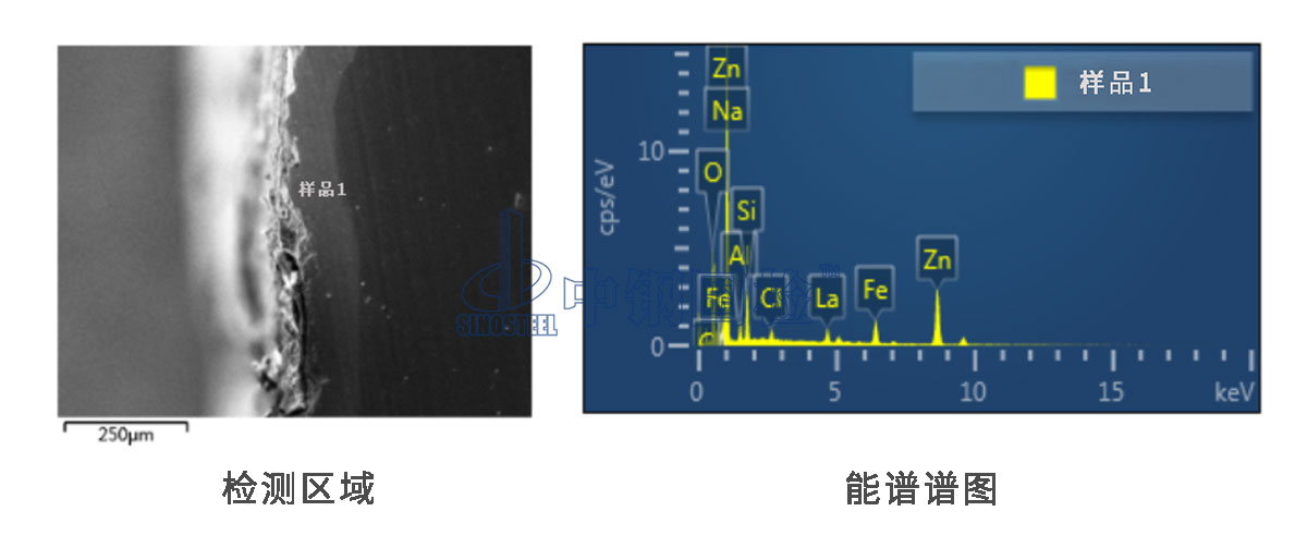 合金共滲層由多種金屬元素組分,采用能譜儀對滲層斷面進行成分定性測試,多元合金共滲層在0μm~5μm范圍內(nèi)任取3點,其中至少有一點應含有Zn、Al、La、Fe等元素。