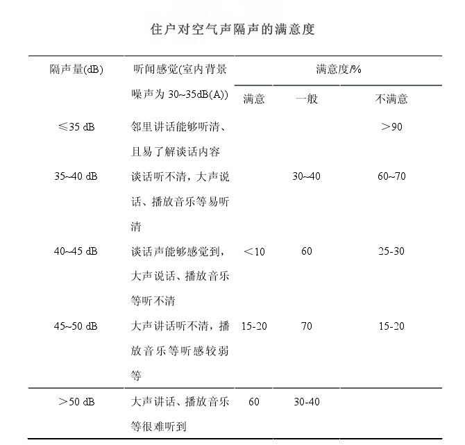住戶對空氣聲隔聲滿意度如上表所示,人居室內(nèi)聲環(huán)境比較理想,且能滿足住戶滿意度的室內(nèi)聲環(huán)境,輕質(zhì)隔墻體隔聲能力應(yīng)至少要達到45dB。因此,對于環(huán)境噪聲和墻體隔聲性能的檢測是必不可少的,并且可以通過檢測手段推動新型材料研發(fā),以消除或減少室內(nèi)產(chǎn)生的噪聲對人體的傷害,提高輕質(zhì)復(fù)合墻體的隔聲性能。