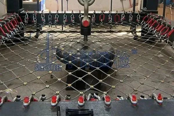 然后采用卸扣、連桿、鋼絲繩或與測(cè)試試樣結(jié)構(gòu)特性一致的連接件將試樣四邊的網(wǎng)格與固定框架四邊固定,通過(guò)連接件將試樣張緊。