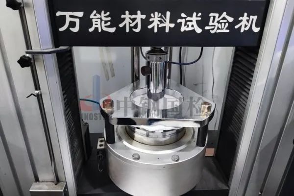 將試樣放入環(huán)形夾具內(nèi),擰緊,防止試樣在刺破過程中滑動或破損。將夾具放在材料試驗機上,調(diào)整高度,應使試樣與圓球頂桿剛好接觸。開啟試驗機,記錄試驗過程中頂壓力-變形曲線,直至試樣完全頂破,記錄最大頂壓力。停機,取出已破壞試樣,觀察和記錄頂破情況。