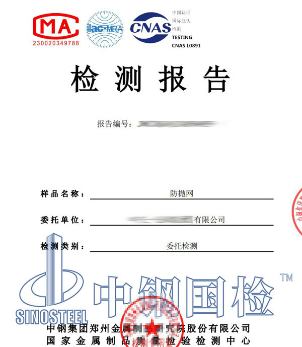 以上就是中鋼國檢根據(jù)客戶委托的樣品檢測項目結(jié)果,出具的防拋網(wǎng)第三方檢測報告,報告加蓋了相關(guān)資質(zhì)印章,具備法律效力,在中鋼國檢官網(wǎng)和國家質(zhì)量監(jiān)督局均線上可查,全國認可,用途廣泛。