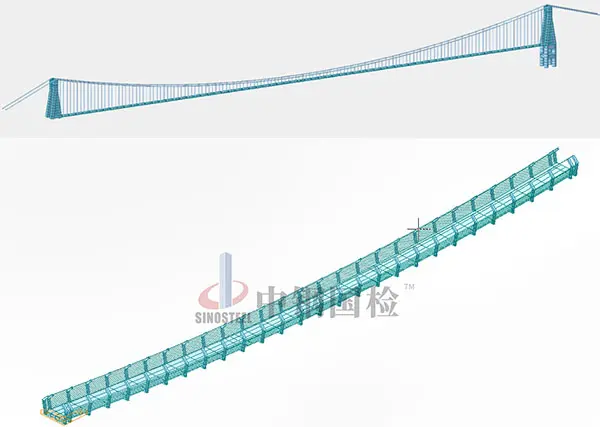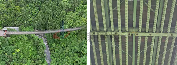 懸索橋,又名吊橋,指的是以通過索塔懸掛并錨固于兩岸(或橋兩端)的纜索(或鋼鏈)作為上部結構主要承重構件的橋梁。其纜索幾何形狀由力的平衡條件決定,一般接近拋物線。從纜索垂下許多吊桿,把橋面吊住,在橋面和吊桿之間常設置加勁梁,同纜索形成組合體系,以減小荷載所引起的撓度變形。懸索吊橋因其結構美觀、跨越能力強以及對周圍環(huán)境影響較小,近年來在景區(qū)中應用頗多,為游客帶來高空、漂浮體驗感的同時,也不乏引起公眾對其安全性的擔憂。定期對景觀橋梁外觀及承載能力進行檢測,是保障公眾安全游玩的首要前提。