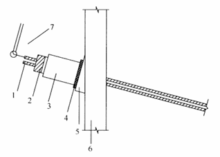 注:1-試驗(yàn)錨桿或土釘;2-工具錨;3-穿心式千斤頂;4-墊板;5-支撐凳;6-噴射混凝土面層、土層;7基準(zhǔn)梁與基準(zhǔn)