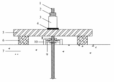注:1-試驗(yàn)錨桿;2-工具錨;3-穿心式千斤頂;4-墊板;5-主梁:6-反力支座;7-墊層;8-位移測(cè)量?jī)x表;9-基準(zhǔn)梁;10-基準(zhǔn)樁