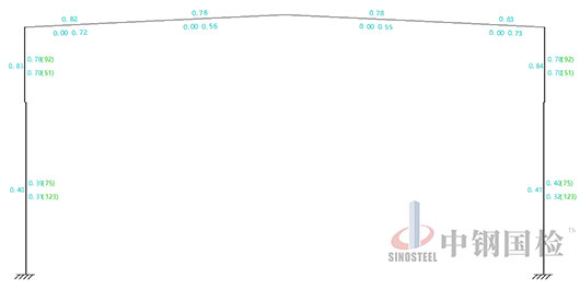 根據(jù)以上檢測及勘查結(jié)果和委托方提供的圖紙等資料,承載能力驗(yàn)算考慮風(fēng)荷載、雪荷載、自重等。 依據(jù)《鋼結(jié)構(gòu)設(shè)計(jì)標(biāo)準(zhǔn)》GB 50017-2017、《建筑結(jié)構(gòu)荷載規(guī)范》GB 50009-2012等規(guī)范并結(jié)合其使用環(huán)境及功能,利用模型計(jì)算軟件進(jìn)行建模驗(yàn)算分析。 結(jié)果圖例如下: