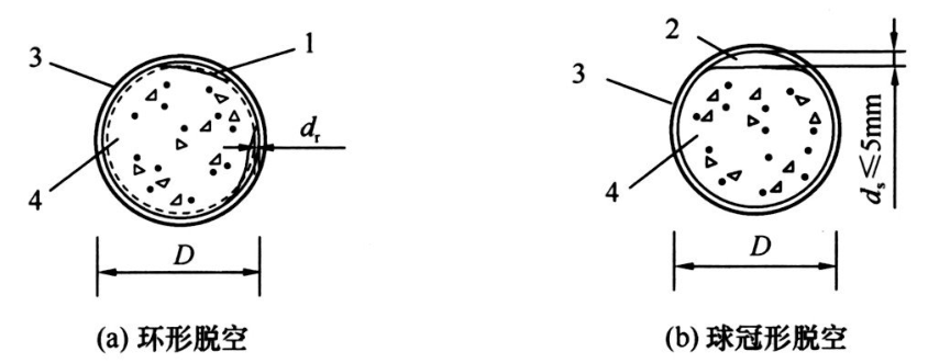 1—環(huán)形脫空;2—球冠形脫空;3—鋼管;4—鋼管內(nèi)混凝土