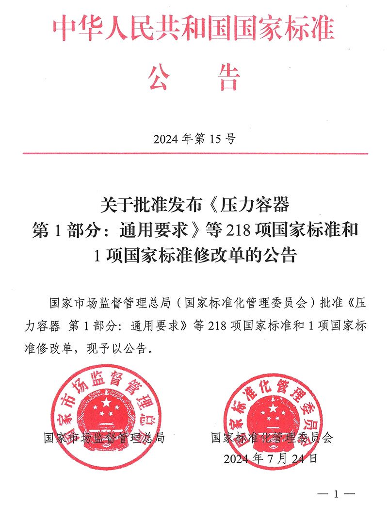 關于批準發(fā)布《壓力容器 第1部分:通用要求》等218項國家標準和1項國家標準修改單的公告