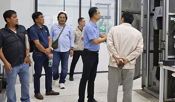 在專業(yè)人員的引領(lǐng)下,菲律賓公共工程與公路部中央助理部長(zhǎng)Loreta M. Malaluan一行走進(jìn)試驗(yàn)室,實(shí)地查看中鋼國(guó)檢試驗(yàn)室條件、檢測(cè)設(shè)備等,并對(duì)菲律賓卡馬拉尼甘大橋項(xiàng)目中所使用的鋼絞線、錨具等關(guān)鍵材料的檢驗(yàn)檢測(cè)過(guò)程進(jìn)行觀摩見(jiàn)證。