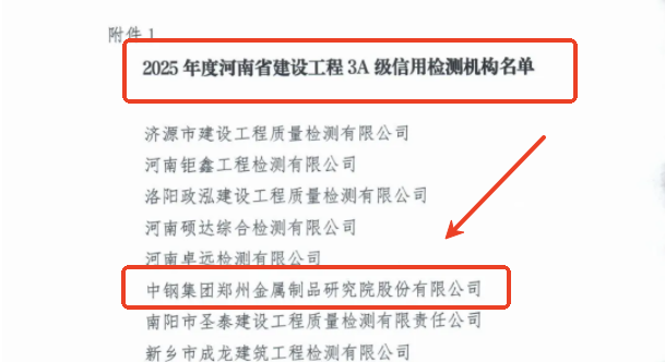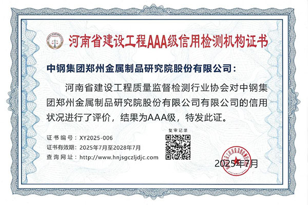 近日,河南省工程質量監(jiān)督檢測行業(yè)協(xié)會公示了2025年度河南省建設工程檢測機構信用評價結果,中鋼集團鄭州金屬制品研究院股份有限公司(以下簡稱中鋼國檢)憑借扎實的專業(yè)基礎和良好的行業(yè)口碑,榮獲AAA級信用評價等級,這一榮譽不僅是對中鋼國檢專業(yè)實力和良好信譽的權威認可,也是對其在建設工程檢測領域卓越表現(xiàn)的肯定。