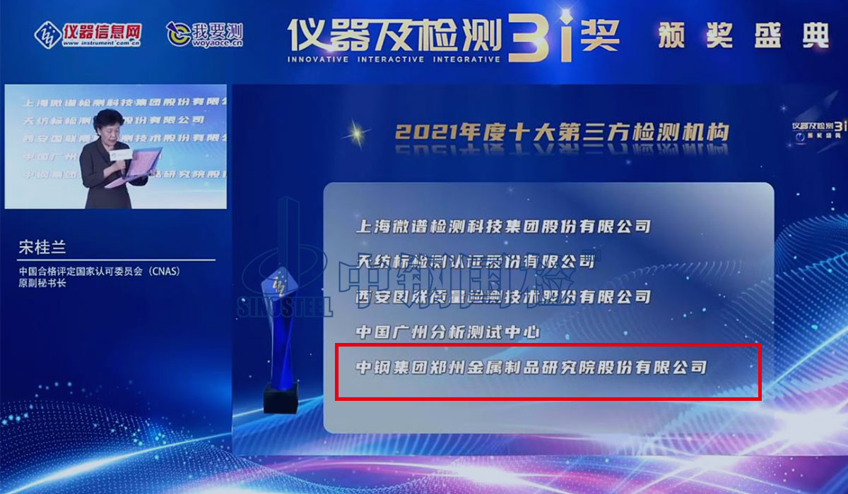 經(jīng)過評選,中鋼國檢獲得“我要測網(wǎng)2021年度十大第三方檢測機(jī)構(gòu)”榮譽(yù)稱號!會議上,由中國合格評定國家認(rèn)可委員會(CNAS)原副秘書長宋桂蘭女士為中鋼國檢進(jìn)行頒獎。此項榮譽(yù)并非能夠輕易取得,中鋼國檢經(jīng)過3輪的重重篩選和激烈角逐,憑借雄厚的實(shí)力和良好的企業(yè)信譽(yù),才最終從118家檢測機(jī)構(gòu)中脫穎而出。