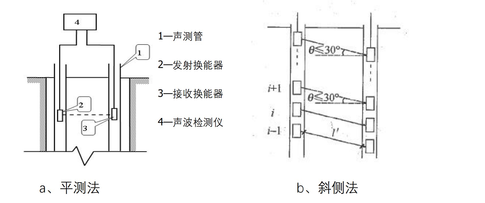 超聲波透射法適用于混凝土灌注樁的樁身完整性檢測,判定樁身缺陷的位置、范圍和程度。適用于樁徑不小于0.6m的混凝土樁,現(xiàn)場檢測方法有平測和斜側(cè)法。