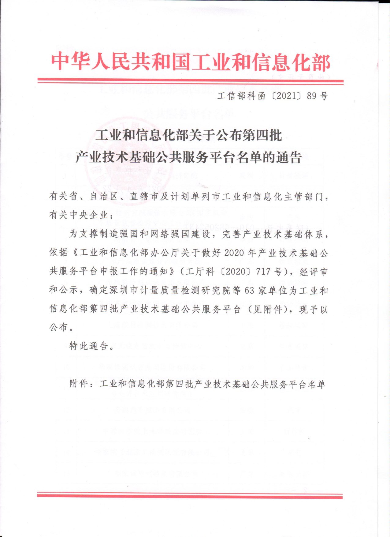 工業(yè)和信息化部關(guān)于公布第四批產(chǎn)業(yè)技術(shù)基礎(chǔ)公共服務(wù)平臺名單的通告