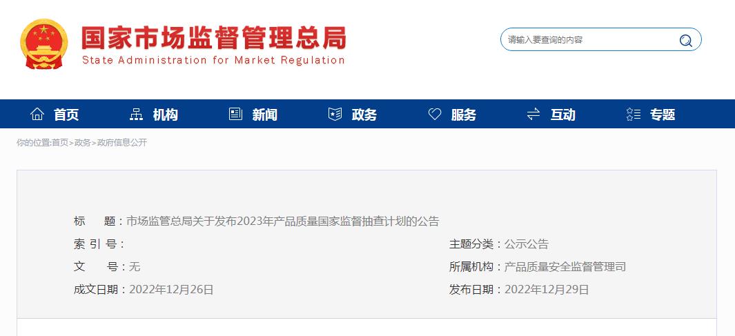 昨日,國家市場監(jiān)督管理總局發(fā)布了《市場監(jiān)管總局關(guān)于發(fā)布2023年產(chǎn)品質(zhì)量國家監(jiān)督抽查計劃的公告》,詳情如下: