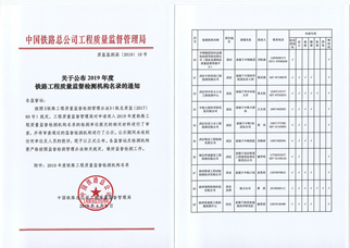 中國鐵路總公司工程質(zhì)量安全監(jiān)督總站頒發(fā)的2019年度鐵路工程質(zhì)量監(jiān)督檢測機(jī)構(gòu)名錄(質(zhì)監(jiān)監(jiān)測函[2019]10號)